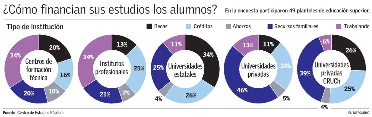 Según la evidencia obtenida, los recursos familiares son la primera fuente de financiamiento, con un 36,8% de los casos, sobre todo en las universidades, convirtiéndose así en la principal forma de pagar los aranceles de las carreras. Más atrás figuran los créditos estudiantiles (23,8%) y las becas (17%). En cambio, el trabajo propio adquiere un rol relevante cuando se estudia en un plantel técnico-profesional (16,6%), al igual que los ahorros (5,5%).