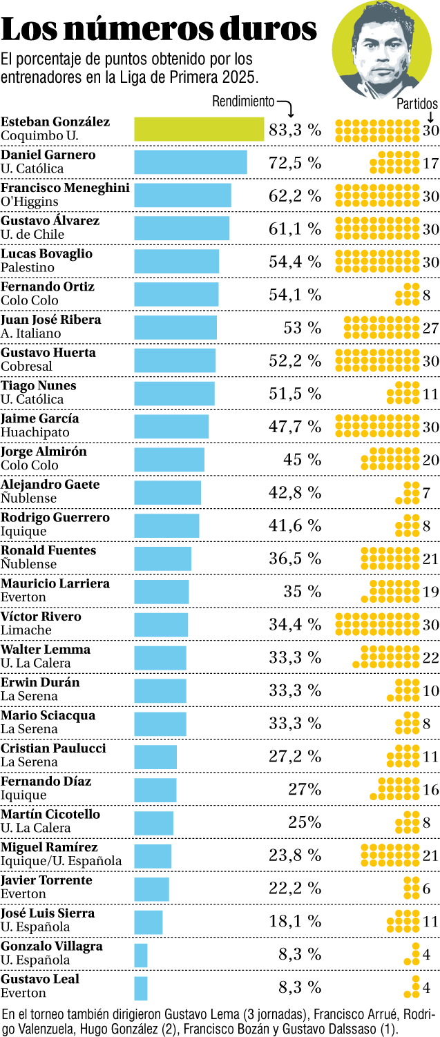 Esteban González (83,3%), Daniel Garnero (72,5 %) y Francisco Meneghini (62,2 %) lideran los rendimientos de una temporada marcada por el reposicionamiento de los técnicos locales, que ganaron todos los torneos: Nacional (González), Ascenso (Cristián Muñoz), Promoción (Patricio Almendra), Copa Chile (Jaime García) y 2ª Profesional (Jaime Vera).