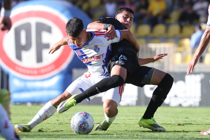 EL rigor físico fue permanente y lo retrata el duelo entre Ignacio Vásquez y Martín Mundaca. El paraguayo Romero terminó jugando de tercer central cuando la U sostenía la ventaja. Foto: Photosport.