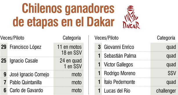 El piloto de la categoría challenger es el undécimo nacional que gana una etapa en la carrera más difícil del mundo. Un listado de éxitos que abrió Carlo de Gavardo y que encabeza Francisco López. Desde 2009 que los representantes locales han vencido en al menos un tramo de la prueba. “Es un tremendo logro”, valoró el santiaguino de 36 años, que va tercero en la clasificación general.